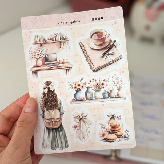 Cozy Studio Planner Sticker Sheet, Light Pink Deco Aesthetic, Journals, Tea and Bows Stickers, Soft Color Palette
